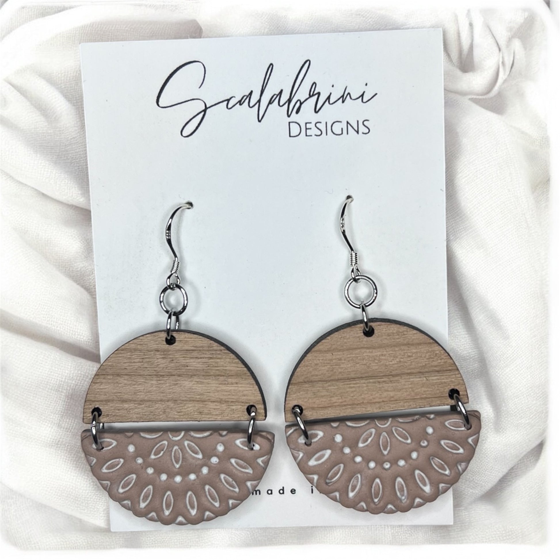 These polymer clay earrings were made using polymer clay and wooden elements. The ear wires are sterling silver.